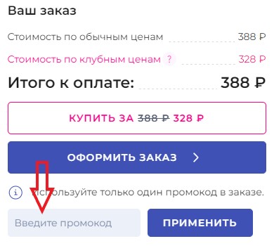 - Найдите в корзине пункт с пометкой «У вас есть промокод? Примените его!» и нажмите на него.