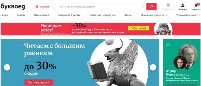 - Широкий ассортимент. Выбор литературы огромен, поэтому из Буквоед вы точно не уйдете без интересной книги.