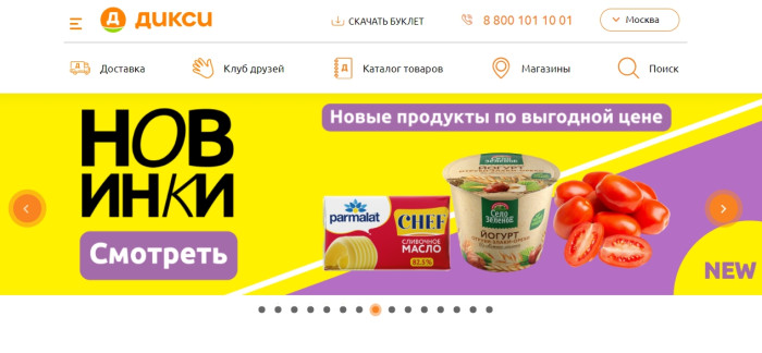 Интернет-магазин "Дикси" представляет собой онлайн-платформу для приобретения продуктов питания и товаров повседневного спроса. Ассортимент включает свежие фрукты и овощи, молочные продукты, мясо, рыбу, хлебобулочные изделия, сладости, напитки, а также бытовую химию и средства гигиены. Пользователи могут удобно и быстро выбрать товары, воспользоваться акциями и скидками, оформить заказ с доставкой на дом или самовывозом из ближайшего магазина.