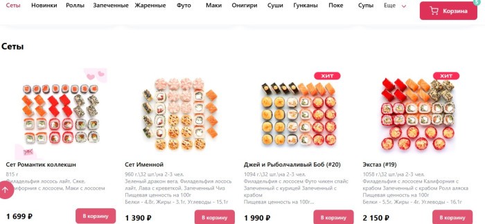 - Широкий ассортимент. Большой выбор сетов и комбинаций блюд на любой вкус и компанию.