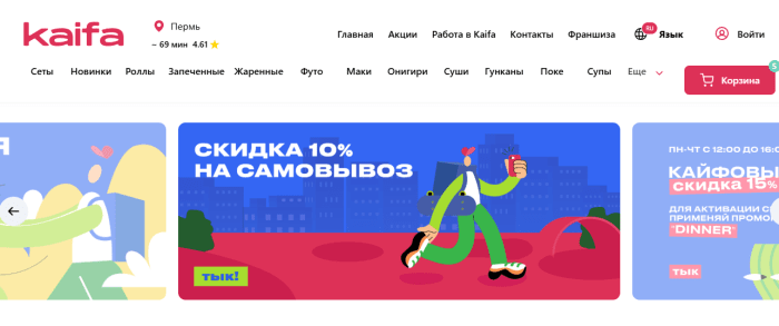 Сервис доставки Kaifa (Кайфа) предлагает своим клиентам вкусную японскую еду, а также пиццу, закуски, салаты и напитки. Kaifa позволяет выбрать блюда, собрать заказ в корзине и оформить доставку прямо на дом или в офис. Меню регулярно обновляется, а в разных городах могут быть локальные предложения и новинки.