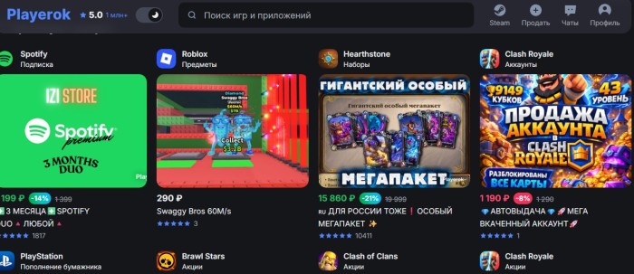 На платформе могут действовать скидки от продавцов, специальные предложения и акции на популярные игровые товары. Также предлагаются промокоды и бонусы для новых и активных пользователей.