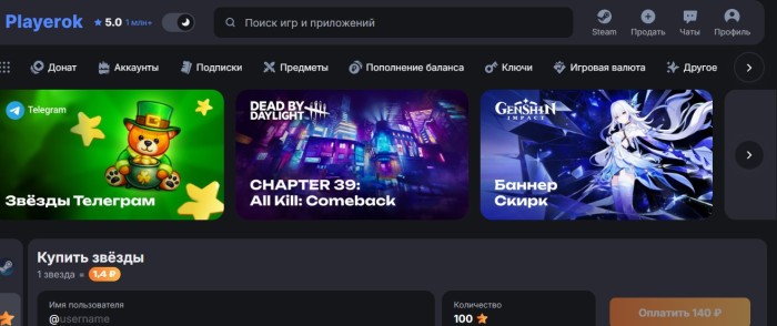 Кроме того, вы можете пополнить свой аккаунт в Steam через Playerok - это простой способ быстро зачислить деньги на игровой аккаунт без сложных обходных схем. Сервис реализовал собственную систему пополнения, где не нужно покупать ключи, подарочные карты или передавать данные аккаунта - всё происходит напрямую по логину.