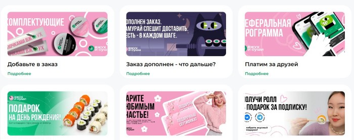 Сервис регулярно проводит акции: скидки на сеты, предложения формата «1+1», подарочные роллы при заказе от определенной суммы, подарки для именинников или за подписку в соцсетях.