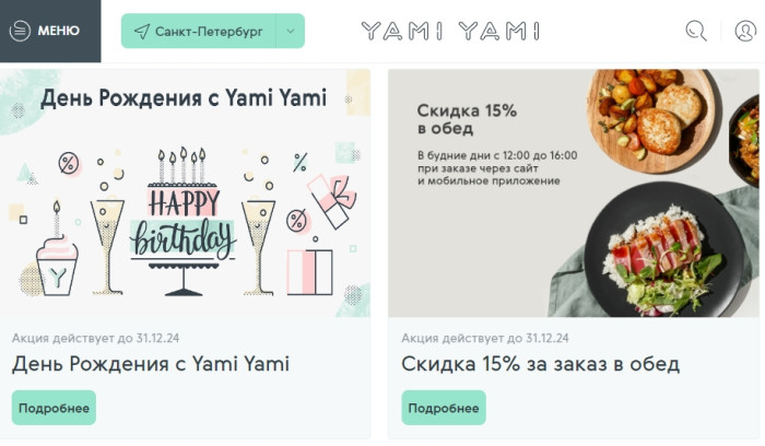 Также в ваш день рождения сервис YAMI YAMI предоставляет скидку, которая приравнивается к количеству исполнившихся лет. Например, если вам исполнилось 20 лет и вы решили отпраздновать день рождения в YAMI YAMI, то получите 20% скидку. Максимальная скидка составляет 35%. Иными словами, если вам исполнилось 40 лет, то вы получите 35% скидку.